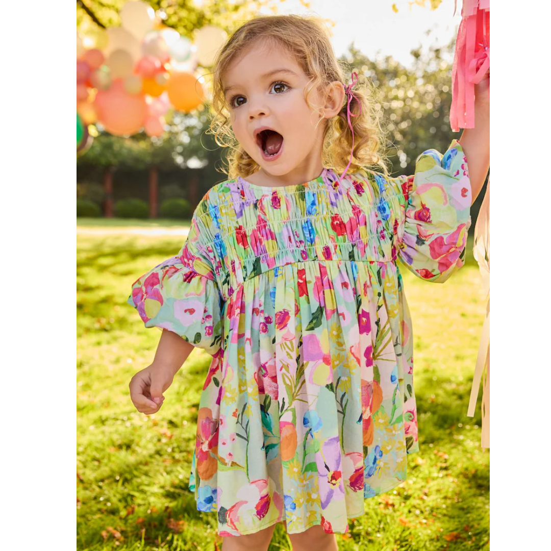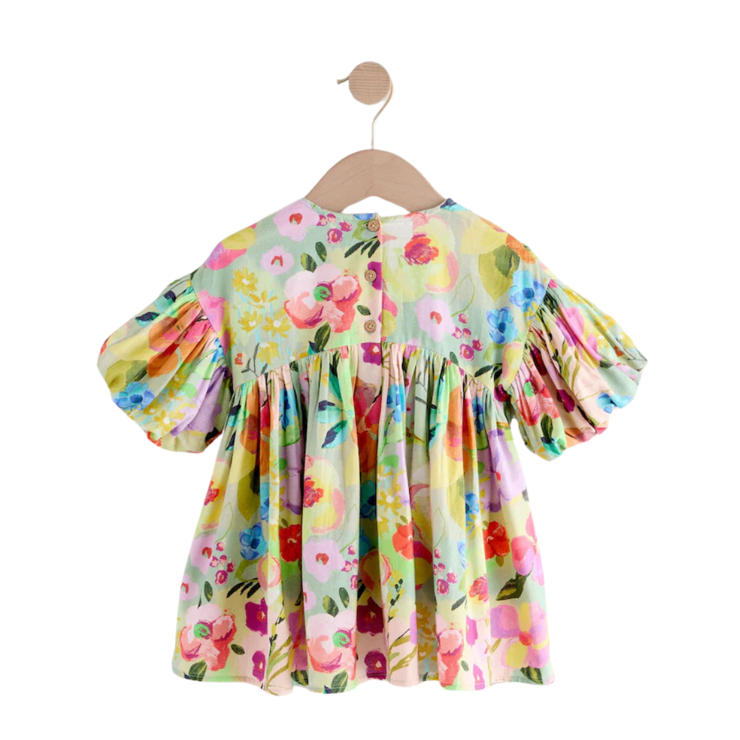 (PREORDER) Green Floral Shirred Puff Sleeve Summer Dress (3mths-8yrs)